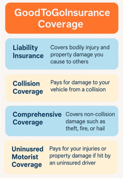 GoodToGoInsurance offers a strong range of coverage options designed for affordability, simplicity, and fast approval. Whether you need basic liability, full coverage, medical protection, SR-22 support, or optional add-ons, their partner carriers provide flexible choices that work for nearly every budget and driver type.